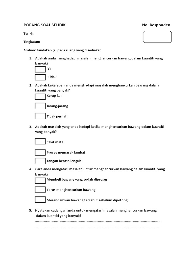 Melayu Malay Cina Chinese India Indian Lain-lain nyatakan. Fill out a Kingdom Hall Volunteer Worker Questionnaire S-82 supplied by the local elders. 5152014 Justeru pengedaran borang soal selidik dalam kajian ini adalah bertujuan untuk mendapatkan maklum balas terhadap persoalan-persoalan kajian serta maklumat yang diperlukandaripada responden iaitu maklumat yang berkaitan dengan sikap dan motivasi pelajar asing terhadap pembelajaran bahasa.