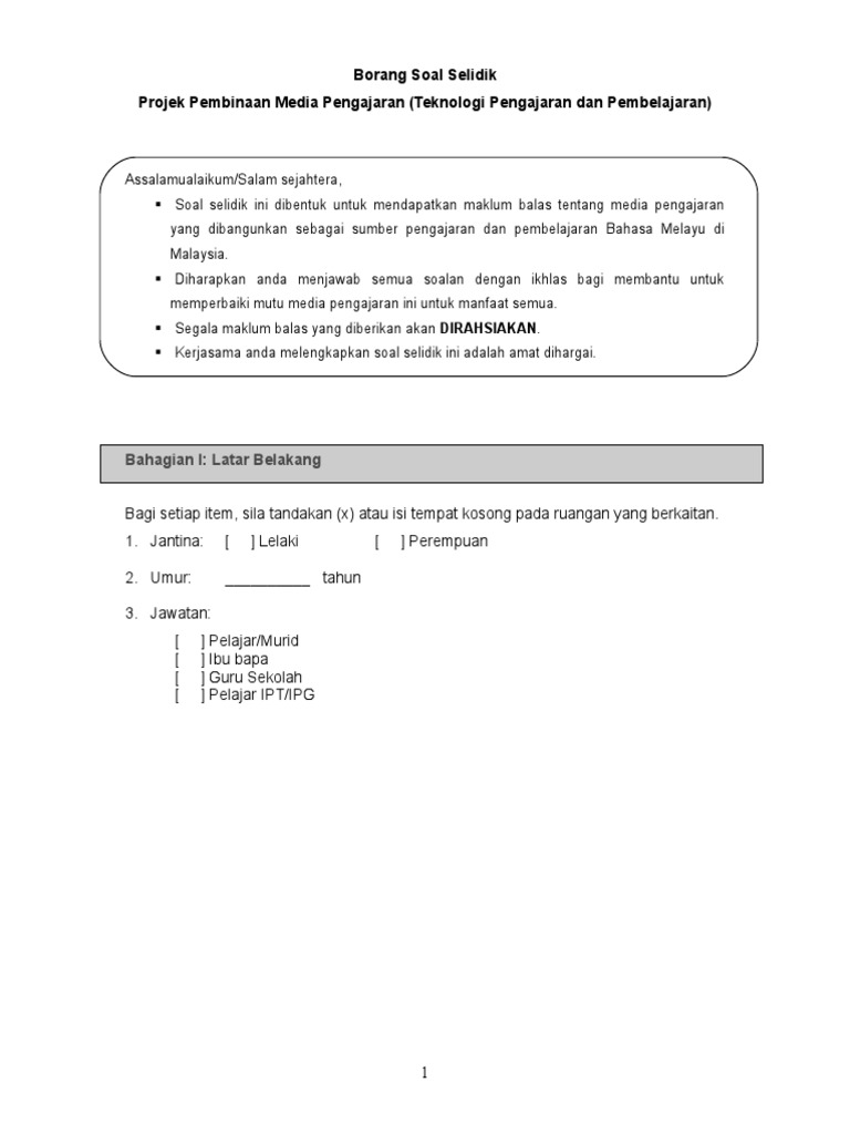 Apa maksud borang soal selidik. Bahagian A mengandungi 5 soalan Bahagian B mengandungi 20 soalan Bahagian C mengandungi 10 soalan dan Bahagian D mengandungi 10 soalan. Bidang perniagaan dan bidang pendidikan merupakan dua bidang yang kerap menggunakan borang soal selidik ini dengan kerap. Anda dihendaki menjawab ketiga-tiga bahagian tersebut.