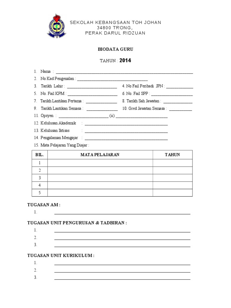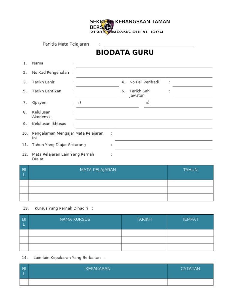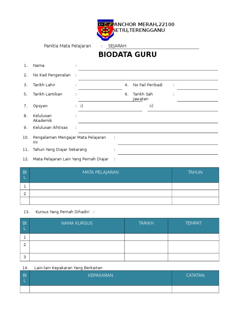 Biodata guru by 1985putra 19550 views. Borang Kosong Kegunaan Staff Link dengan dengan laman kpm dan link lain Lagu Sekolah kebangsaan Sikamat Masa berurusan dengan Pejabat SK Sikamat Maklumat Tahun 2013. Borang Maklumat Guru Panitia.