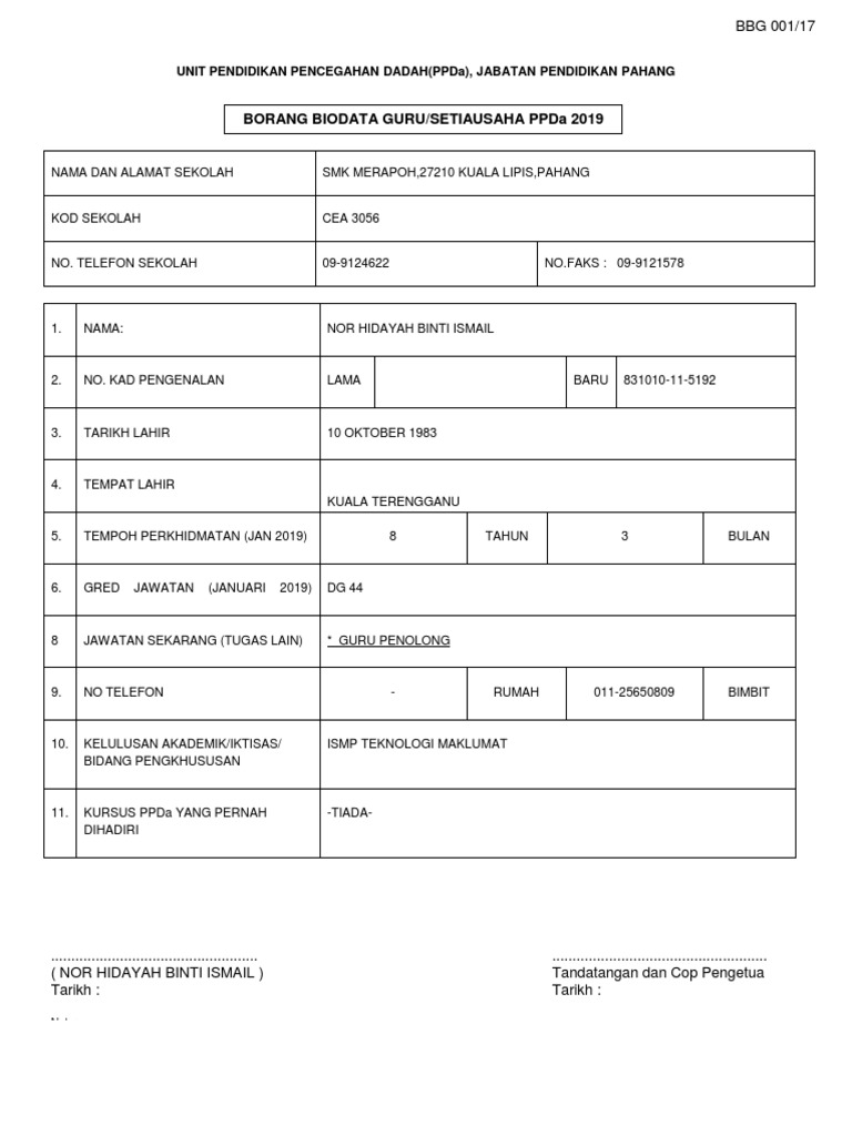 View Lampiran Borang PBSdocx from PRAKTIKUM 3133 at IPG Kampus Bahasa Melayu. Tinggal masukkan data anda kemudian print. Doc Borang Maklumat Peribadi Guru Bil Butir Peribadi Hamzah Hamat Academia Edu.