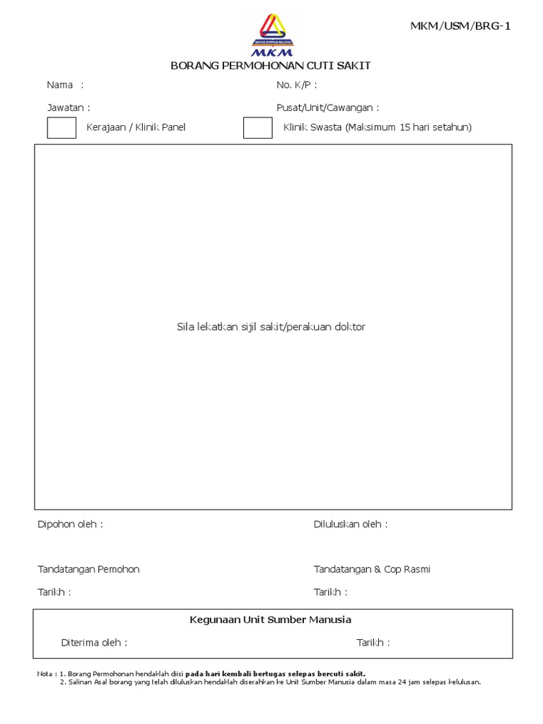 Borang cuti sakit kerajaan. Pemohon telah diberitahu dan cuti telah direkod. Tandatangan Pegawai yang Meluluskan Cuti UNTUK KEGUNAAN PEJABAT Baki cuti pemohon berjumlah hari. 6232020 Pastikan dalam tempoh 4 hari atau lebih ini sepanjang anda dapat MC atau cuti sakit anda langsung tidak pergi ke tempat kerja anda.