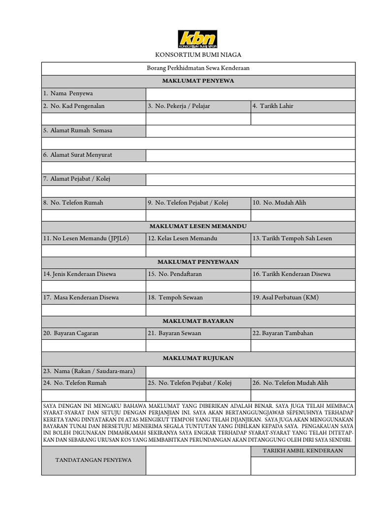 Kenderaan ini tidak digunakan untuk segala jenis aktiviti jenayah atau kesalahan undang-undang Negara Malaysia. Nombor pendaftaran kenderaan Model kereta Maklumat penyewa seperti nama nombor kad pengenalan nombor telefon alamat etc. Borang Tempahan Kereta Sewa.