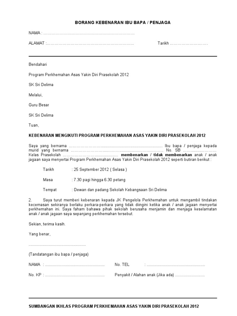 Contoh surat kebenaran ibu bapa. Ibu bapa. Pihak urusetia akan berusaha sedaya upaya untuk menjaga keselamatan pelajar-pelajar dan memastikan segala peraturan dipatuhi oleh anak anak jagaan tuanpuan sepanjang kegiatan ini diadakan demi mengelakkan perkara-perkara yang tidak diingini daripada berlaku.