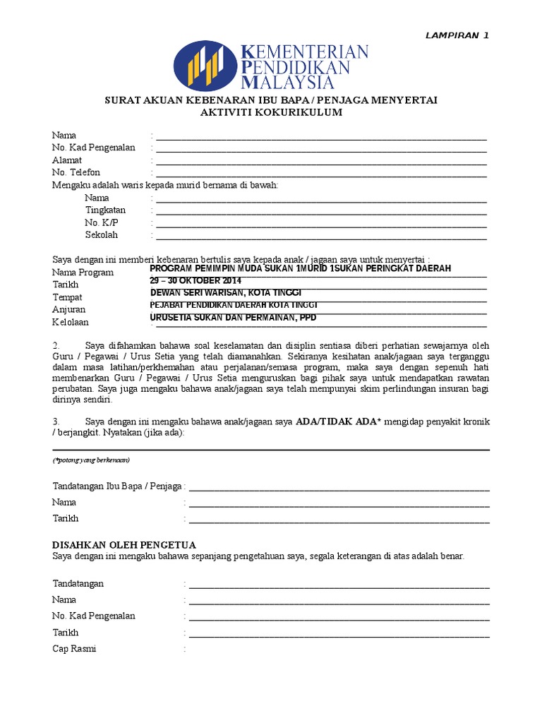 Lampiran 2 Surat Akuan Kebenaran Ibu Bapa Penjaga Menyertai Aktiviti Kokurikulum Saya No. Contoh Borang Kebenaran Ibu Bapa. For more information and source see on this link.