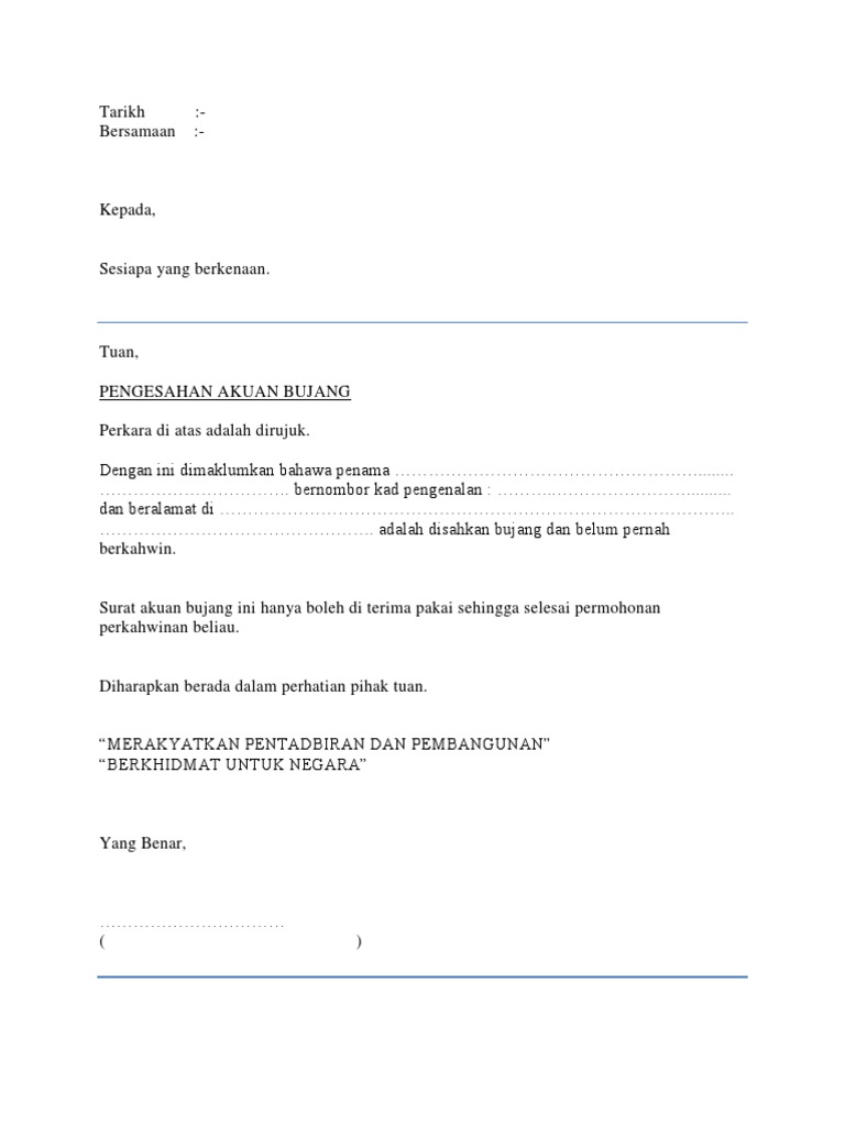 Borang pengakuan bujang. 1222020 Contoh Surat Pengakuan Bujang Untuk Berkahwin Yyyyyy 10 xxxx adalah seorang pekerja di syarikat ini dan mengikut rekod syarikat kami si polan bin si polan adalah masih seorang bujang dan belum pernah berkahwin. 07 2076333 Fax. Pendahuluan 1 1 setiap perkahwinan yang akan dilangsungkan hendaklah terlebih dahulu.